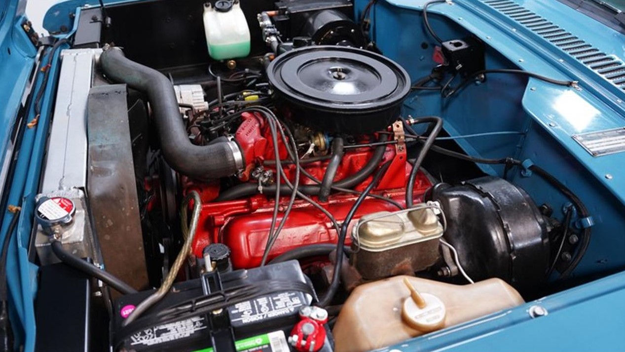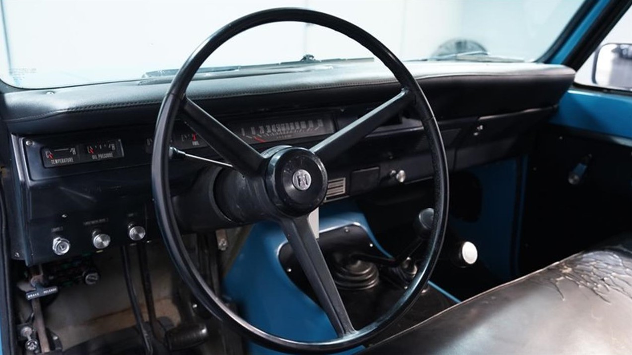 The cabin shows a mix of that newer blue paint and patina. The dash and door panels, and the strip of horizontal gauges seem to have held up well, but the black vinyl on the front split-back bench seat is definitely showing its age (though there should be no shortage of automotive upholstery shops able to recover it). Power steering and front disc brakes will make a weekend drive to a faraway coast (or one of those specialists) more convenient and pleasant.