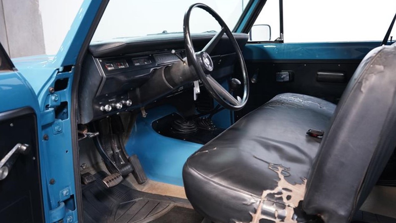 The 1971 Scout II you see here has the 304, which is connected to a column-shift BorgWarner T90 three-speed manual gearbox. It also seems to have received a sequel of its own in the form of newer bright blue paint on the body and removable Traveltop, and a black grille, brush guard, bumpers, mirrors, door handles, side stripes, and running boards. The wheels are also black, and come wrapped in Toyo Open Country all-terrains. Four-wheel drive and Dana 44 axles get that rubber rolling over challenging terrain.