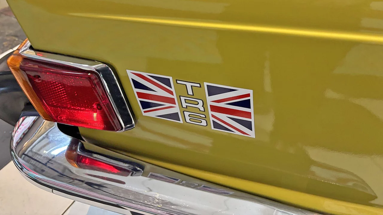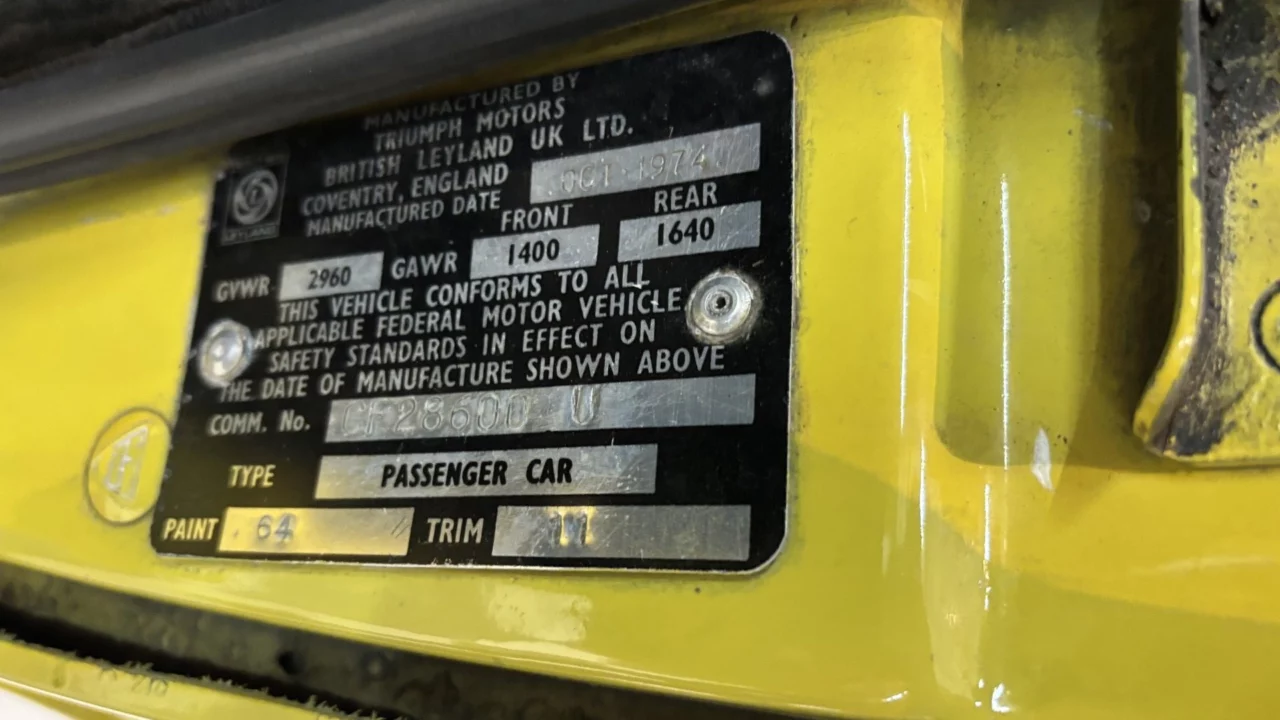 The exterior of this TR6 looks to be in good shape overall. The gaps of the doors, hood, and trunk, all look to be good, though better on the passenger door than the drivers door, which could use a little better alignment. This just means messing with hinge bolts and shims and is not a nightmare. Overall the fit is great for a driver level TR6. The car is said to have been repainted in 2020. Happily, the owner chose to have it repainted in the correct Mimosa Yellow (paint code 64) that this car was delivered with, as it is one of the nicer TR6 colors. The paint look shiny, but there is evidence of some minor overspray. You can see the paint code on the ID tag for the car.