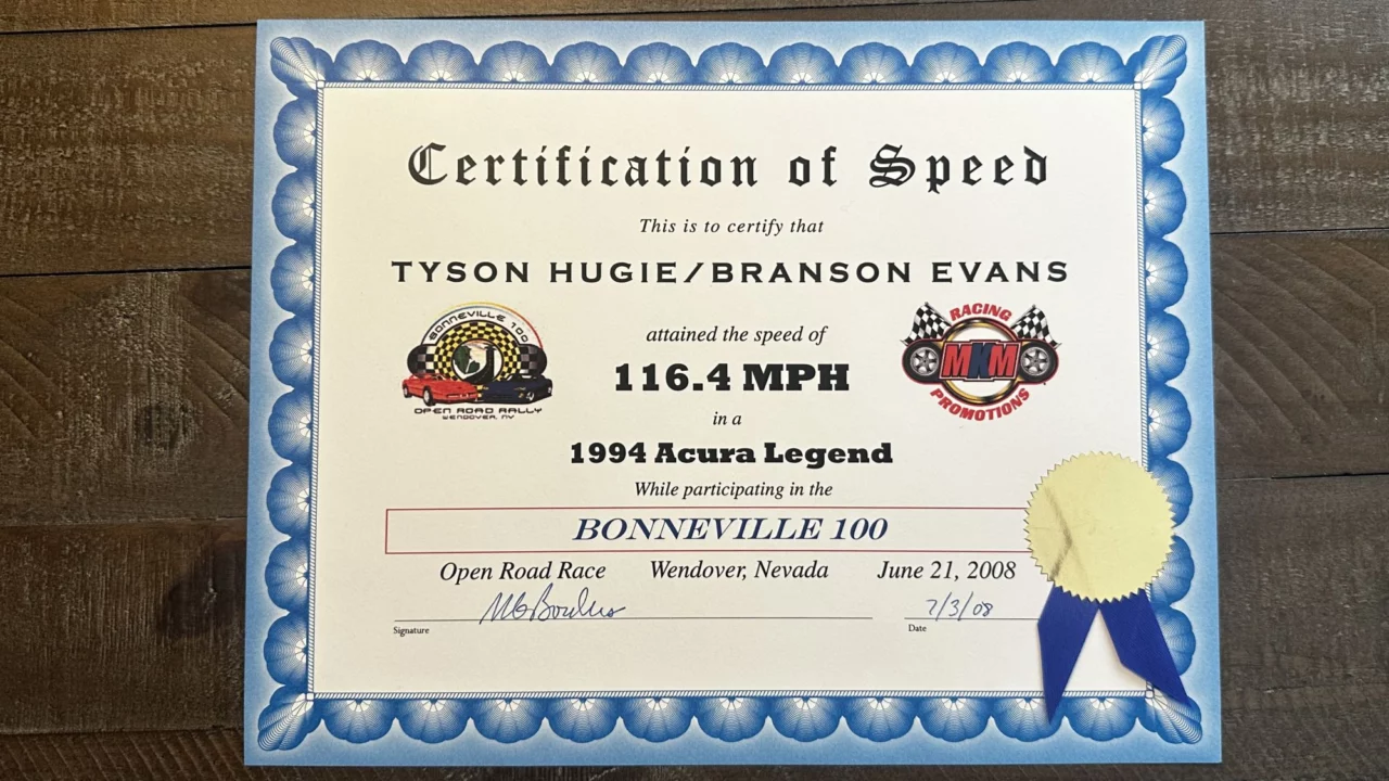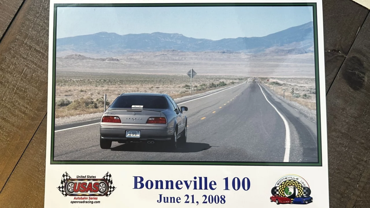 Now for a bit of story time: I participated in the 105-mph class of an open-road race in 2008 called the “Bonneville 100.” Following some rookie training, tech inspections, and pre-race briefings in advance, my navigator Branson and I were staged at the grid just outside of Wendover, Nevada (near the Bonneville Salt Flats) according to speed class. I was in my (then-329,000-mile) 1994 Acura Legend.